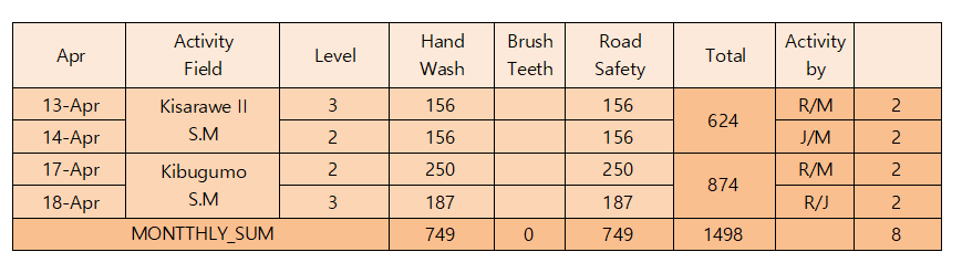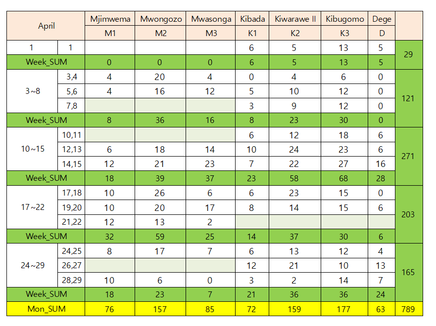 위 표의 연한 초록색의 빈칸은 휴일을 의미하는데 길거리 교실은 4일(Good Friday, Good Monday, Iddi, Uniion day)을 쉬었고 총 참석자 수는 789명입니다. Dege 보건소의 참석율이 매우 낮은 이유는 비때문에 도로가 잠겨 학생들이 등교를 못하기 때문입니다.