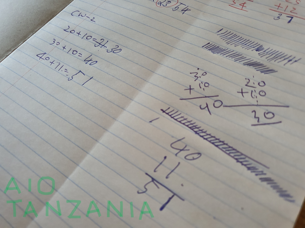 사진의 이 공책은 음지므웨마 초등학교 5학년 학생의 것으로, 여전히 종이에 막대를 그려 개수를 세며 셈을 합니다. 그 이유는 초등학교 저학년 때 배워야 했을 기본 산술을 못했기 때문이고, 지금까지 사는데 문제가 없었기 때문인데, 문제는 기본 산술을 잘 못하는 이 아이가 수학적 개념이 필요한 위 학년이 되면 공부를 포기한다는 것입니다. 막대를 열심히 그려 숫자를 세고 답을 쓰지만, 막대를 모두 그리기에는 숫자가 상당히 크고, 우리가 아는 십진법의 연산으로 10개씩 띄워서 그리면 그나마 좋겠지만 그 개념을 이 아이의 머릿속에 넣어주기 쉽지 않고,